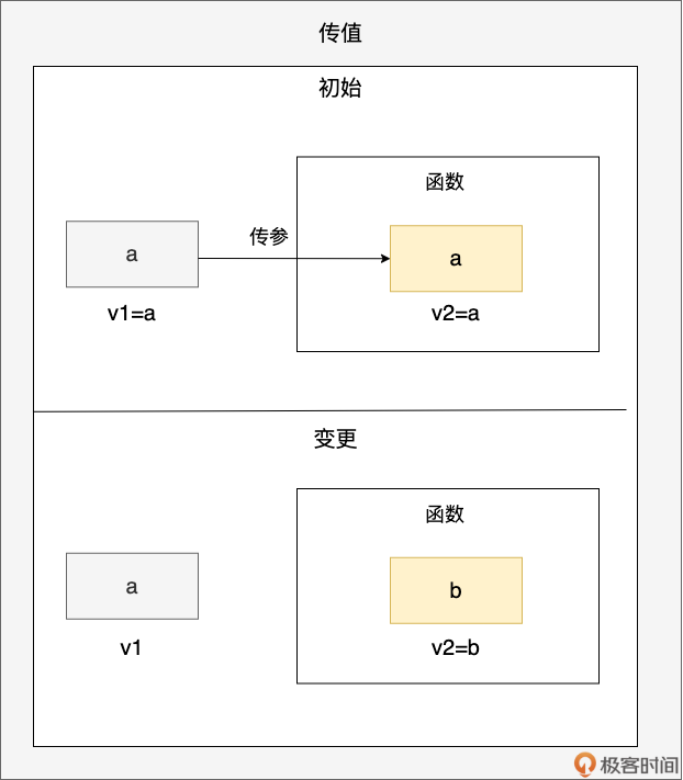 通过上面传值的示意图,我们看到值变量 v1(初值为 a)被传递到函数参数 v2 中,之后函数内 v2 的值更新为 b,但并不影响 v1,v1 的值仍为 a,用代码表示即为:
