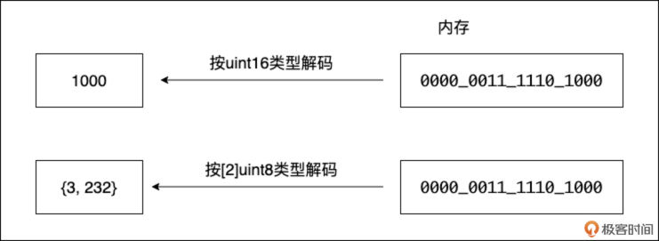 - 如果用 [2]byte(长度为 2 的字节数组)类型去解释,它可能代表两个字节,数值分别是 3 和 232。