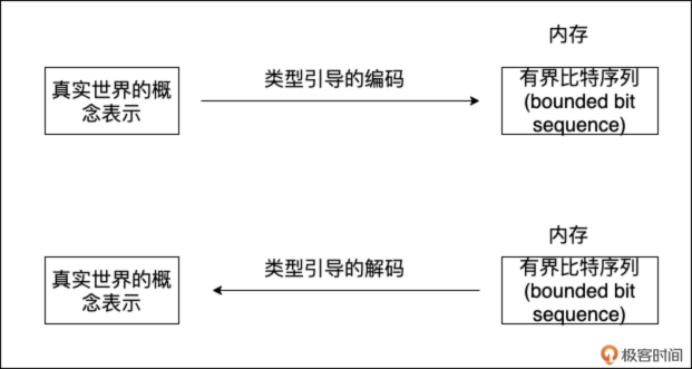 而类型(type),则赋予了这段比特序列以含义。同一段比特序列,用不同的类型去“解码 (decode)”,会得到完全不同的结果。