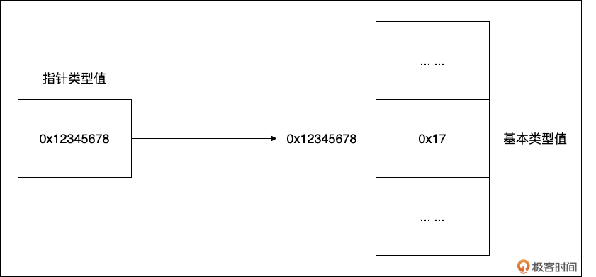 我们看到:指针类型值为 0x12345678,这个值是另外一个内存块(值为0x17)的地址。指针类型值在 Go 语言以及 C、C++ 这一的静态语言中扮演着极其重要的角色。