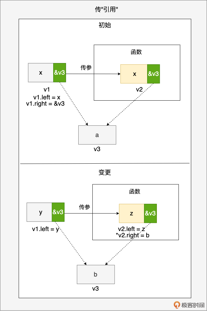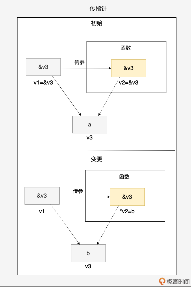 通过上面传指针的示意图,我们看到指针变量 v1(初值为 v3 的地址)被传递到函数参数 v2 中,v1 和 v2 拥有相同的指针值,都指向 v3 变量所在的内存块(初值为 a)。当函数通过 v2 指针解引用修改 v3 的值为 b 后,v1 也能感受到相同的变化。用代码表示即为: