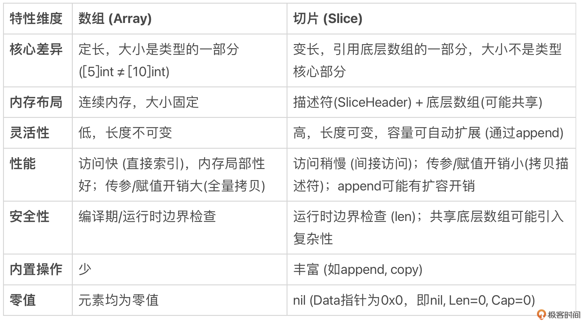 在本讲中,我们深入对比了 Go 语言的数组和切片,探讨了它们在性能与灵活性上的核心权衡,并重点揭示了使用切片时可能遇到的性能“代价”与常见“陷阱”。