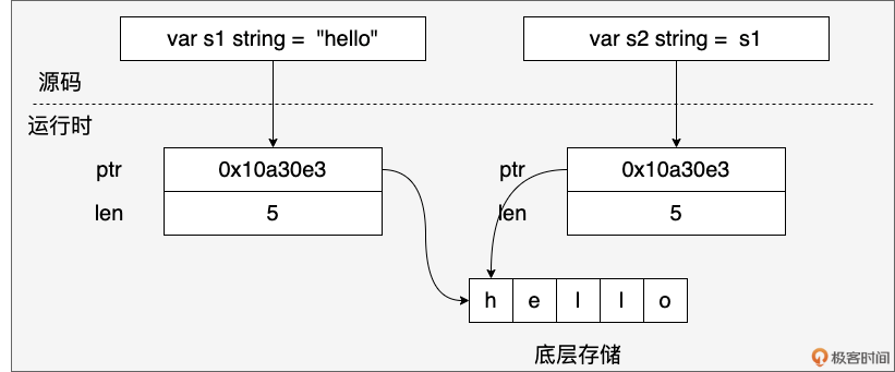 虽然我们在源码层面感觉字符串像字符序列或字节序列,但在 Go 的运行时,一个 string 变量实际上是一个简单的结构体,包含两个字段: