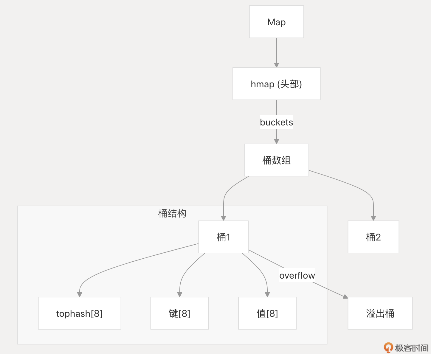 我的《Go语言第一课》专栏中有关于 Go 1.24 之前 map 实现的说明,这里再用一幅示意图简要说明一下: