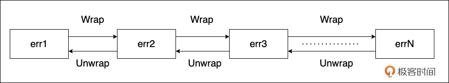 如图所示,从左到右是错误链的包装次序,err1最先被Wrap,接下来是err2,以此类推,直到errN。从右至左是错误链的解包装次序,errN先被解包装处理,接下来是errN-1,以此类推,直到err1。像这种由错误逐个包裹而形成的链式结构,我们就称之为错误链。